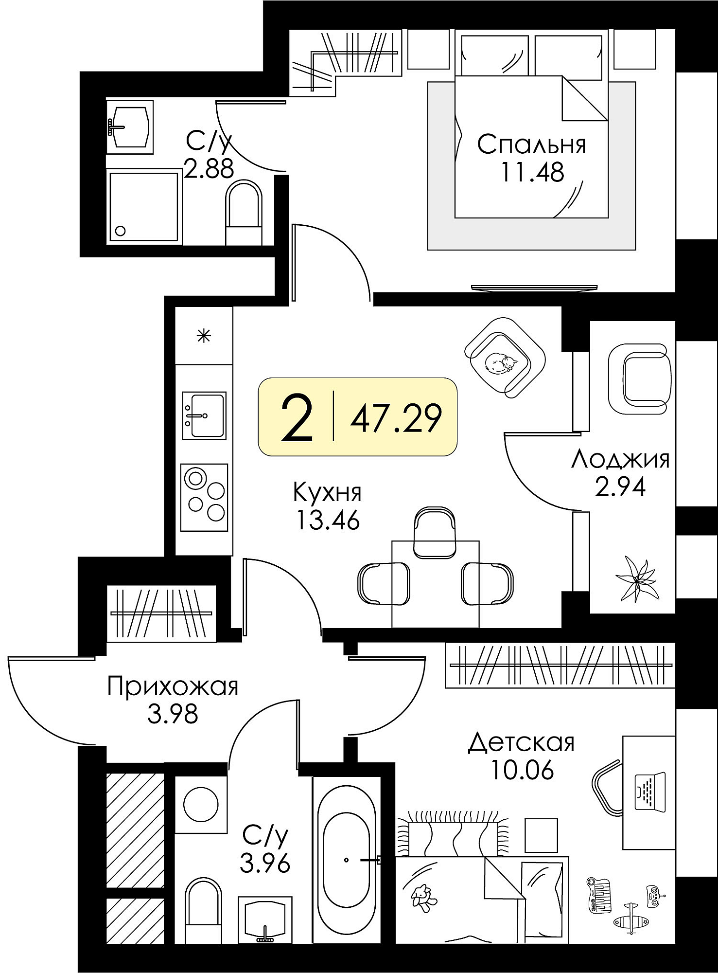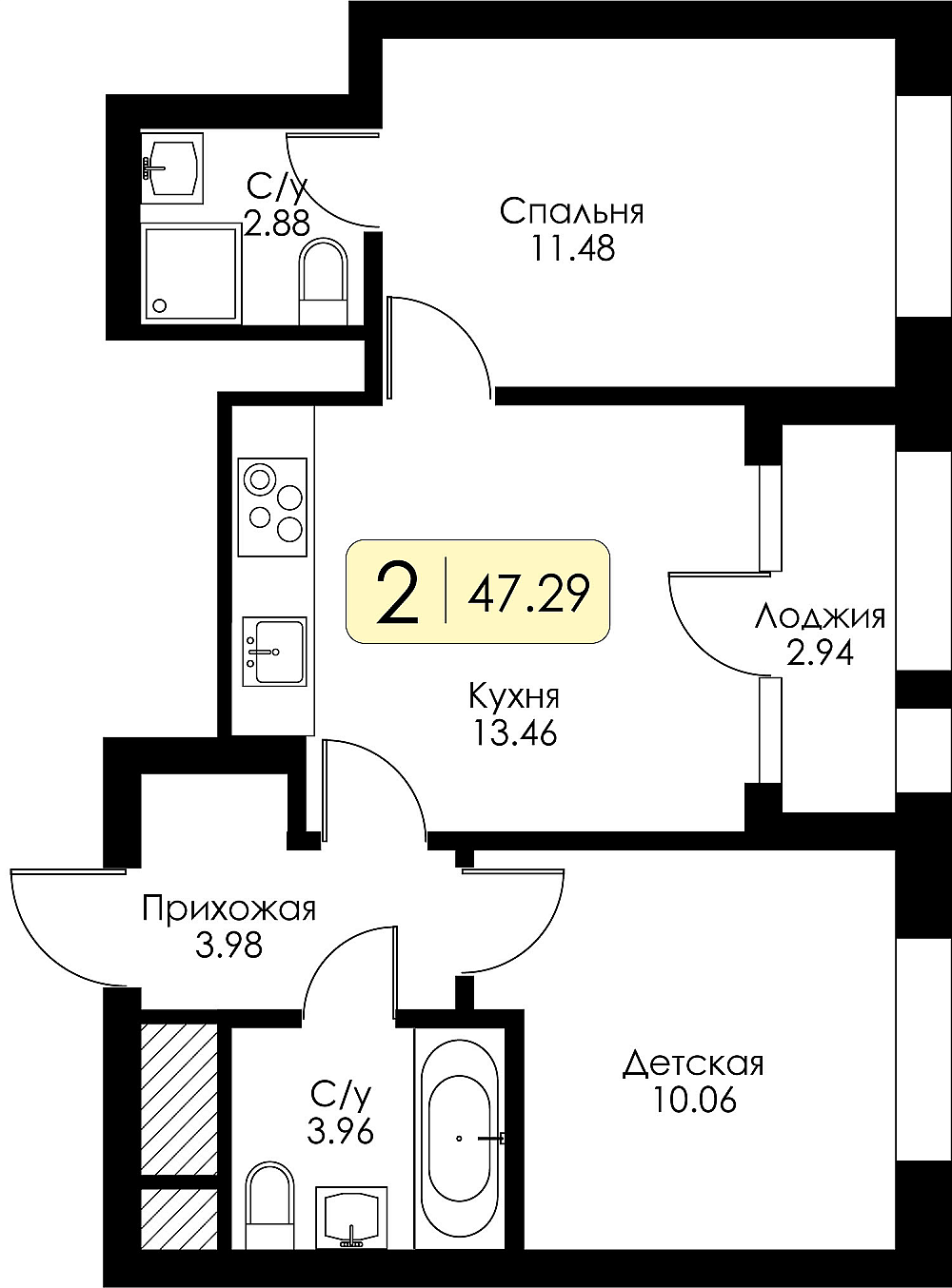 Двухкомнатная квартира №14 с чистовой отделкой, Корпус 1, Секция 1