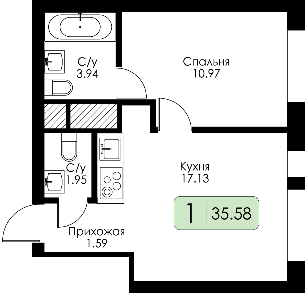 Однокомнатная квартира №196 с чистовой отделкой, Корпус 1, Секция 1