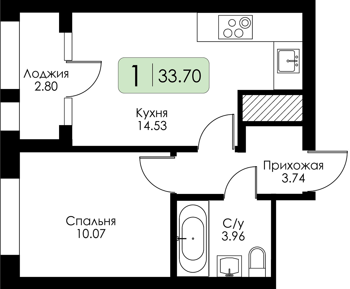 Однокомнатная квартира №238 с предчистовой отделкой, Корпус 1, Секция 1