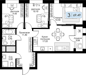 Трехкомнатная квартира №49 с предчистовой отделкой, Корпус 1, Секция 1